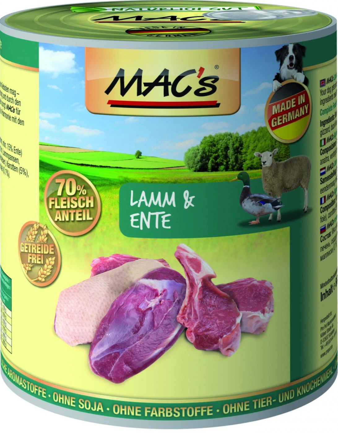 Lamm & Ente von MACs ist ein besonders bekömmliches getreidefreies Nassfutter mit einen hohen Fleischanteil von 70 %, der ausschließlich aus Muskelfleisch und Innereien von Ente und Lamm besteht. Da sowohl Lamm als auch Ente leicht verdaulich sind und zudem kein Getreide enthalten ist, wird dieses schmackhafte Fleischmenue besonders gut vertragen. Der hohe Fleischanteil und die Kombination von Muskelfleisch und Innereien ist sehr artgerecht und steht in Einklang mit den natürlichen Ernährungsbedürfnissen des Hundes als Fleisch fressendem Raubtier. In allen Futtermitteln von MACs stammt das verarbeitete Fleisch ausschließlich von deutschen Schlachthöfen, künstliche Stoffe zur Konservierung, Färbung oder Geschmacksverstärkung werden nicht eingesetzt. Die verarbeiteten Karotten versorgen ihren Hund mit Vitaminen und Ballaststoffen, was ebenfalls die Bekömmlichkeit des Futters verbessert und dazu beiträgt, dass Ihr Hund die wertvollen Inhaltsstoffe auch optimal verwerten kann. Als weitere wirksame Bestandteile sind Ginkgo und Grünlipp-Muschelextrakt zu nennen: Ginkgo fördert die Durchblutung des Gehirns, während Grünlipp-Muschelextrakt natürliches Chondroitin liefert, das wichtig ist für die Gesunderhaltung der Gelenke Ihres Hundes und damit für seine Beweglichkeit. Durch eine Mineralstoffmischung wird sichergestellt, dass Ihr Hund täglich mit allem versorgt wird, was er benötigt.