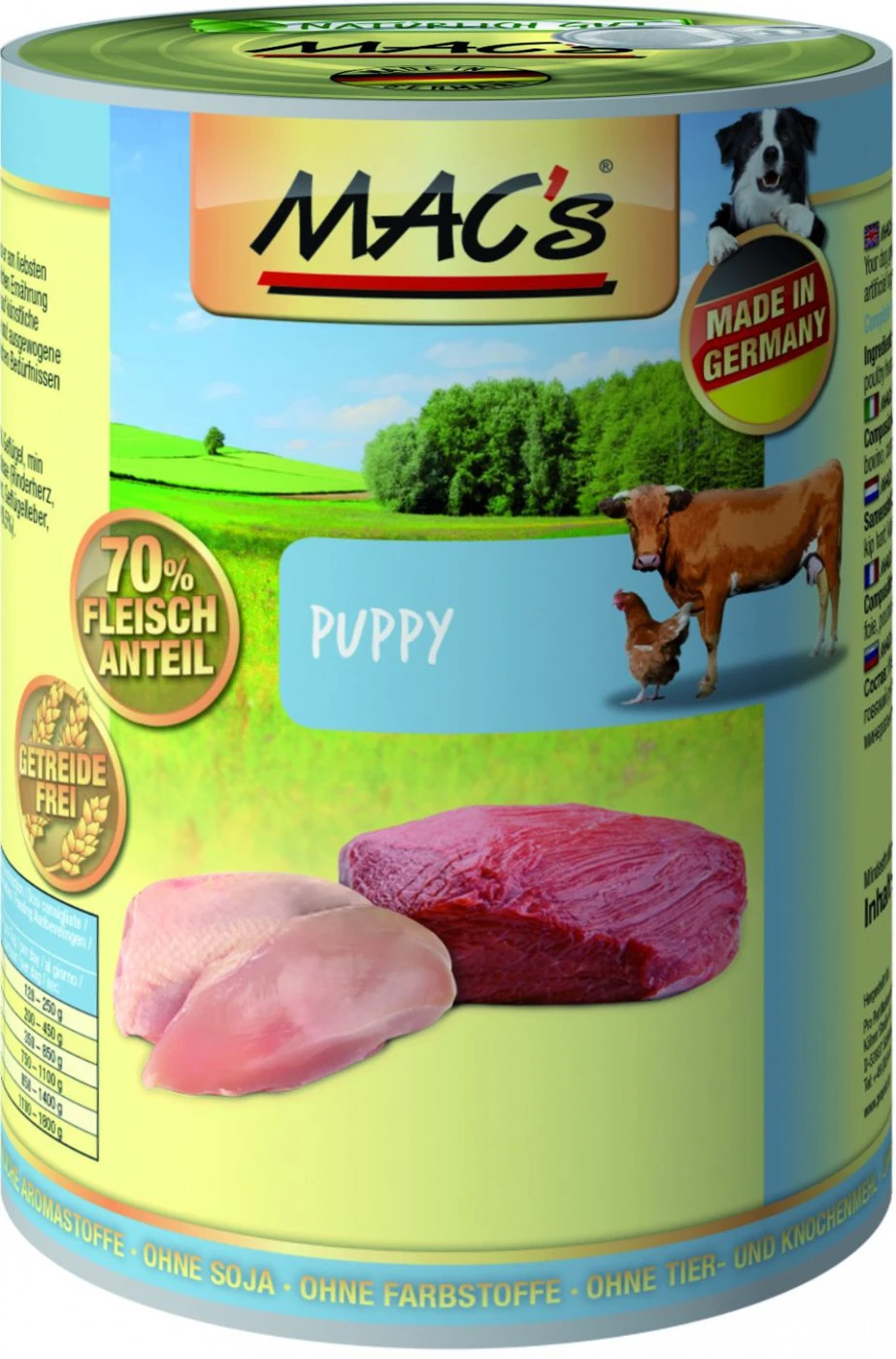 MACs Dog Puppy ist eine ausgewogene Spezialnahrung ohne Getreide für Hundewelpen, die sorgsam auf den besonderen Bedarf von heranwachsenden Junghunden abgestimmt wurde und die wir Ihnen hier im Vorratspack mit 6 Dosen zu 400 g anbieten. Die geschmackvolle Rezeptur enthält eine hochwertige Kombination aus Rind- und Geflügelfleisch und bietet damit Ihrem Welpen sämtliche Nährstoffe, Vitamine und Mineralien, die für ein gesundes Wachstum nötig sind, wobei in der zugesetzten Mineralmischung ein Extraaugenmerk auf Calcium gelegt wurde, das die Entwicklung starker Knochen und Gelenke fördert und damit die Grundlage für einen guten Start ins Hundeleben legt. Ansonsten ist auch dieses Welpen-Spezialfutter ein typisches MACs Nassfutter, das Ihren Welpen bereits zu Beginn seines Lebens gesund und artgerecht ernährt. Die reine Fleischmahlzeit weist einen hohen Anteil von 70 % an frischem Fleisch und Innereien auf, was dem Welpen den unverfälschten Fleischgeschmack bietet, den er seiner Natur als Raubtierjunges nach benötigt. Dies stellt aus mehreren Gründen eine natürliche – getreidefreie – Ernährung dar: Der hohe Gehalt an tierischem Protein legt die Grundlage für eine optimale Versorgung des Welpen mit essentiellen Aminosäuren, die für den Aufbau einer leistungsfähigen Muskulatur ebenso gebraucht werden wie für eine optimale Funktion des Stoffwechsels. Ebenso naturnah ist der Einsatz von Innereien neben dem Muskelfleisch, denn dieser Mix entspricht der natürlichen Struktur der Beute eines Fleischfressers. Künstliche Zutaten zur Konservierung, Färbung oder Geschmacksverstärkung, die den Organismus des Welpen belasten könnten, sind in MACs Puppy nicht enthalten. Wenn die Ernährung Ihres Welpen mit dieser hochwertigen MACs Spezialnahrung Ihren Erwartungen entsprechen sollte, empfehlen wir Ihnen bereits jetzt einen Blick auf die vielen MACs Nassfutter für erwachsene Hunde bei uns im Shop zu werfen, denn Welpen wachsen sehr schnell und schon bald steht die Umstellung auf normales Hundefutter an, wofür MACs Produkte hervorragend geeignet sind.