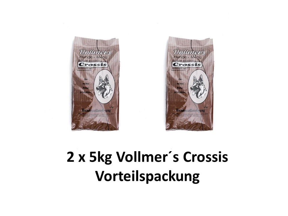 Zu den vielen verschiedenen Futtermitteln des renommierten deutschen Herstellers Vollmer gehören auch die Crossis, die wir Ihnen im 2x 5 kg Sack nach Hause liefern. Die Crossis sind eine Vollnahrung auf Frischfleischbasis (ohne Sojaeiweiß!) mit erhöhtem Energiegehalt, die normal aktiven bzw. sehr aktiven Hunden verbrauchte Energie zurückgibt, sie in Topkondition hält und eine höhere Leistungsbereitschaft verleiht. Die Rezeptur der Crossis basiert auf neuesten wissenschaftlichen und praxisbezogenen Erkenntnissen, wobei ausschließlich Zutaten von bester Qualität eingesetzt werden. Hergestellt wird diese Kraftnahrung mittels des speziellen Extrusionsverfahrens von Vollmer, das die Rohstoffe schonend aufbereitet und eine vollwertige und schmackhafte Ernährung ermöglicht. Eine Besonderheit dieses modernen Verfahrens ist die Einbringung von Geflügelfetten unter Vakuum sowie die Ummantelung der einzelnen Crossis mit einer schmackhaften Geflügelbrühe, wodurch die wichtigen Omega 3 und Omega 6 Fettsäuren eingebracht werden, die so entscheidend sind für eine gesunde Hautkonstitution und die Ausbildung eines schönen Fellkleides. Vollmer hat einen exklusiven Bio-Vital-Komplex entwickelt, der in vielen Vollmer Futtermitteln eingesetzt wird und dazu beiträgt, Alterungsprozesse der Gelenke, Sehnen und Knorpel zu verlangsamen und auch das Bindegewebe schützt und Entzündungen vorbeugt. Dieser Bio-Vital-Komplex ist auch in den Crossis enthalten, deren Rezeptur übrigens insoweit verbessert wurde, als dass der Fleischanteil auf 31,5 % erhöht wurde, was einem Gehalt an Frischfleisch von 80 % entspricht. Wie für alle Trockenfutter von Vollmer gibt es auch für die Crossis zwei alternative Darreichungsformen – sie können nämlich feucht mit etwas temperierten Wasser übergossen werden oder natürlich trocken verfüttert werden.